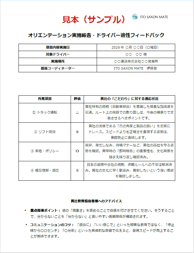 | 1-Day オリエンテーション & フィードバック ※1 +21日間メールサポート (21-Day MATEサポート) ※3 | ¥88,000 (消費税込み) / (1名・1日につき) | 現場密着型の完全オーダーメイド研修 ・横乗り実地訓練(運転・リフト荷役) ・貴社独自のルール/伝統の伝承 ・社内制度(休暇など)の説明 ・「実地オリエンテーション報告書」の提出 ※2 ・メール対応による初期サポート |